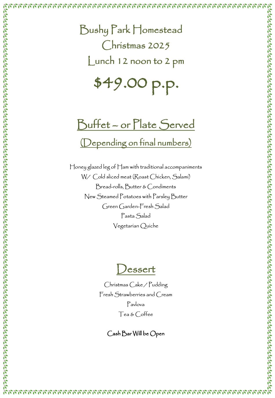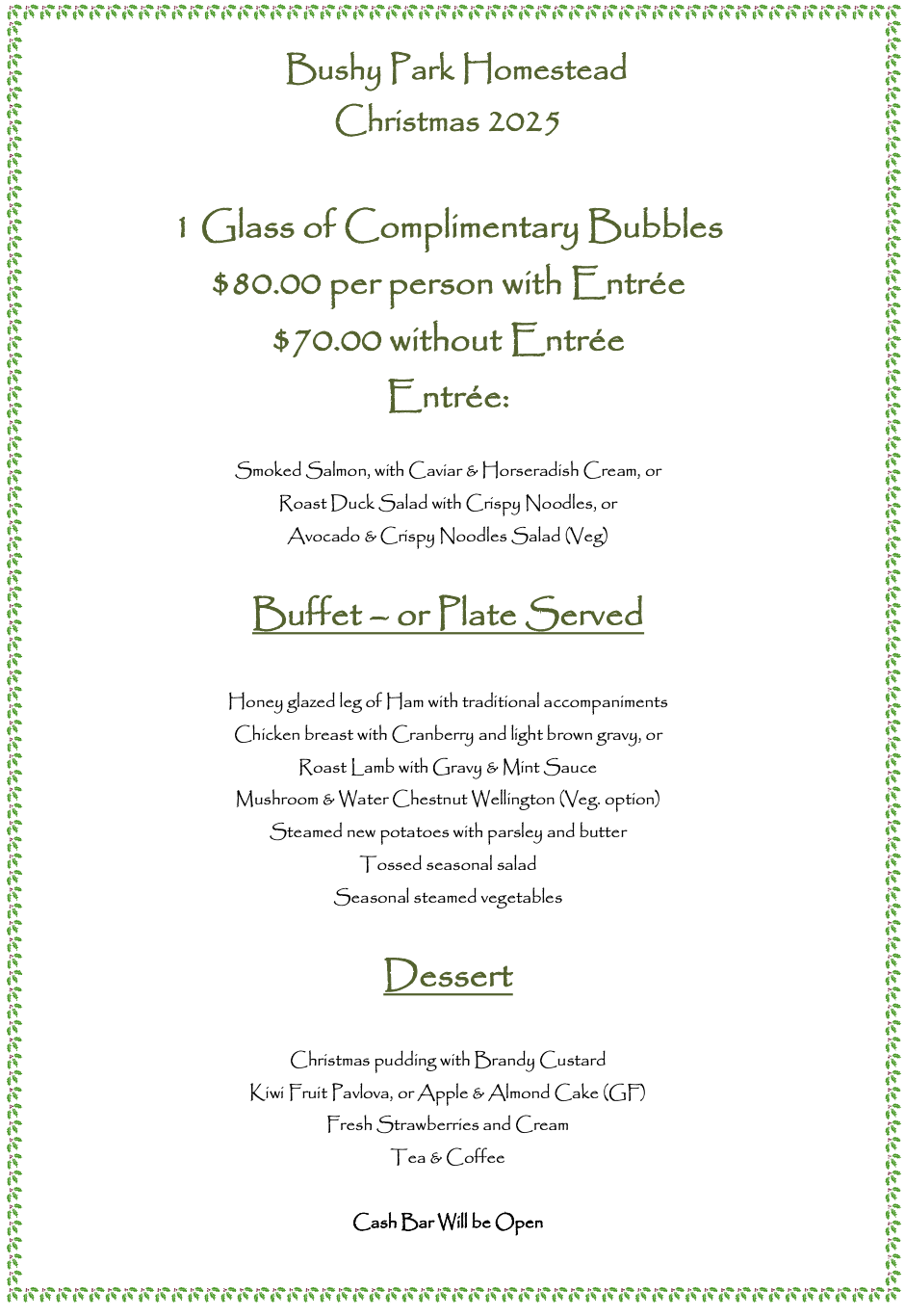 25th October 2025 to 1st February 2026 – Open Weekends & Public Holidays only, group bookings by appointment.